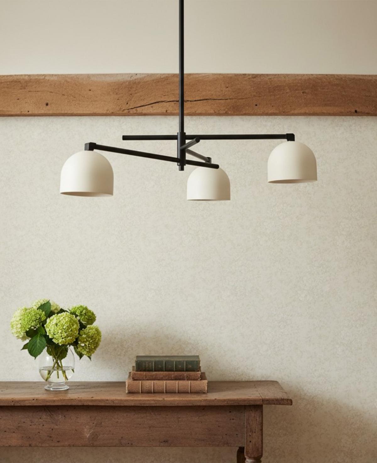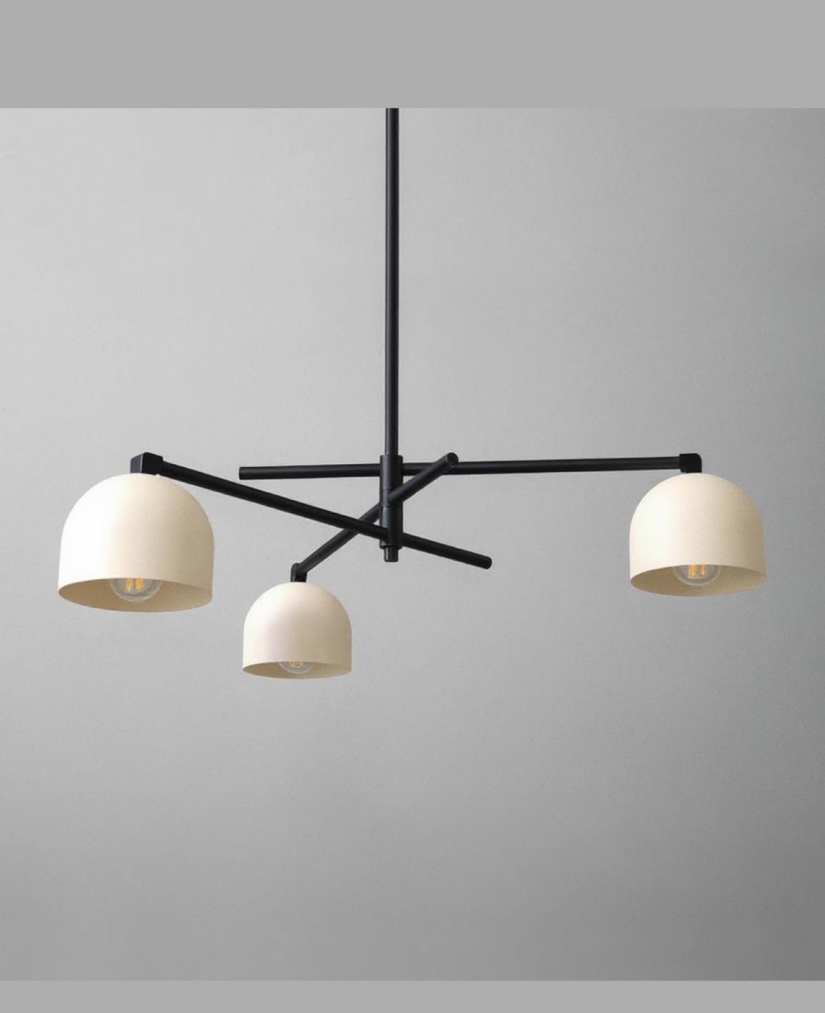 Minimalist tasarıma sahip, üç adet mat bej başlığı ve siyah metal gövdesiyle modern ve şık bir aydınlatma çözümü sunan avize.
