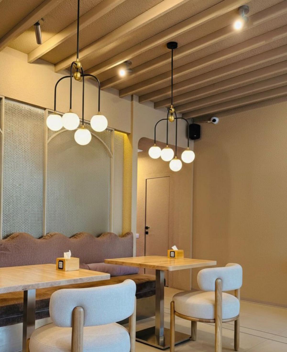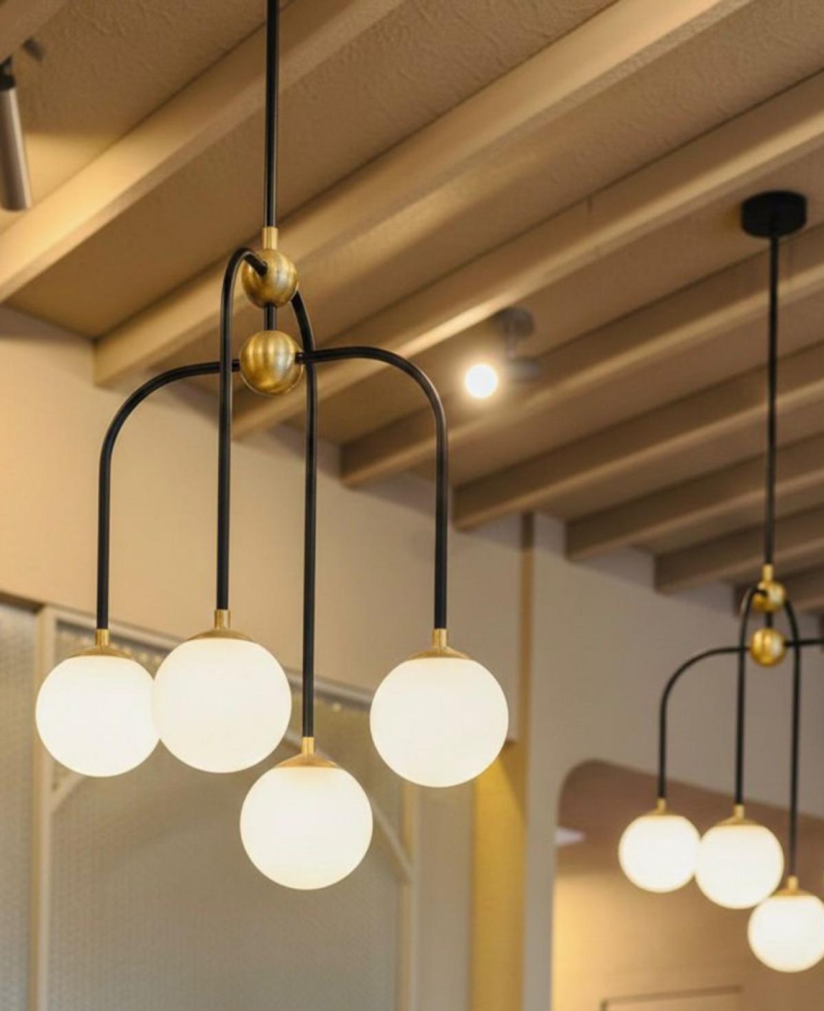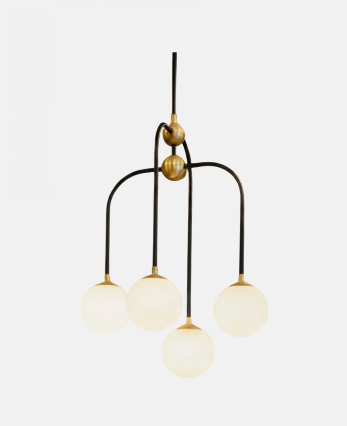 Zarif kavisli siyah metal gövdeyi altın rengi birleşim noktaları ve beyaz opal cam kürelerle buluşturan, estetik ve modern bir aydınlatma tasarımı.