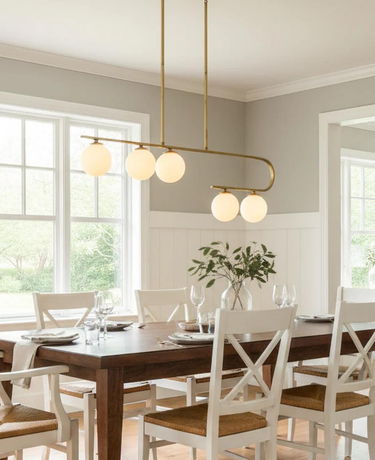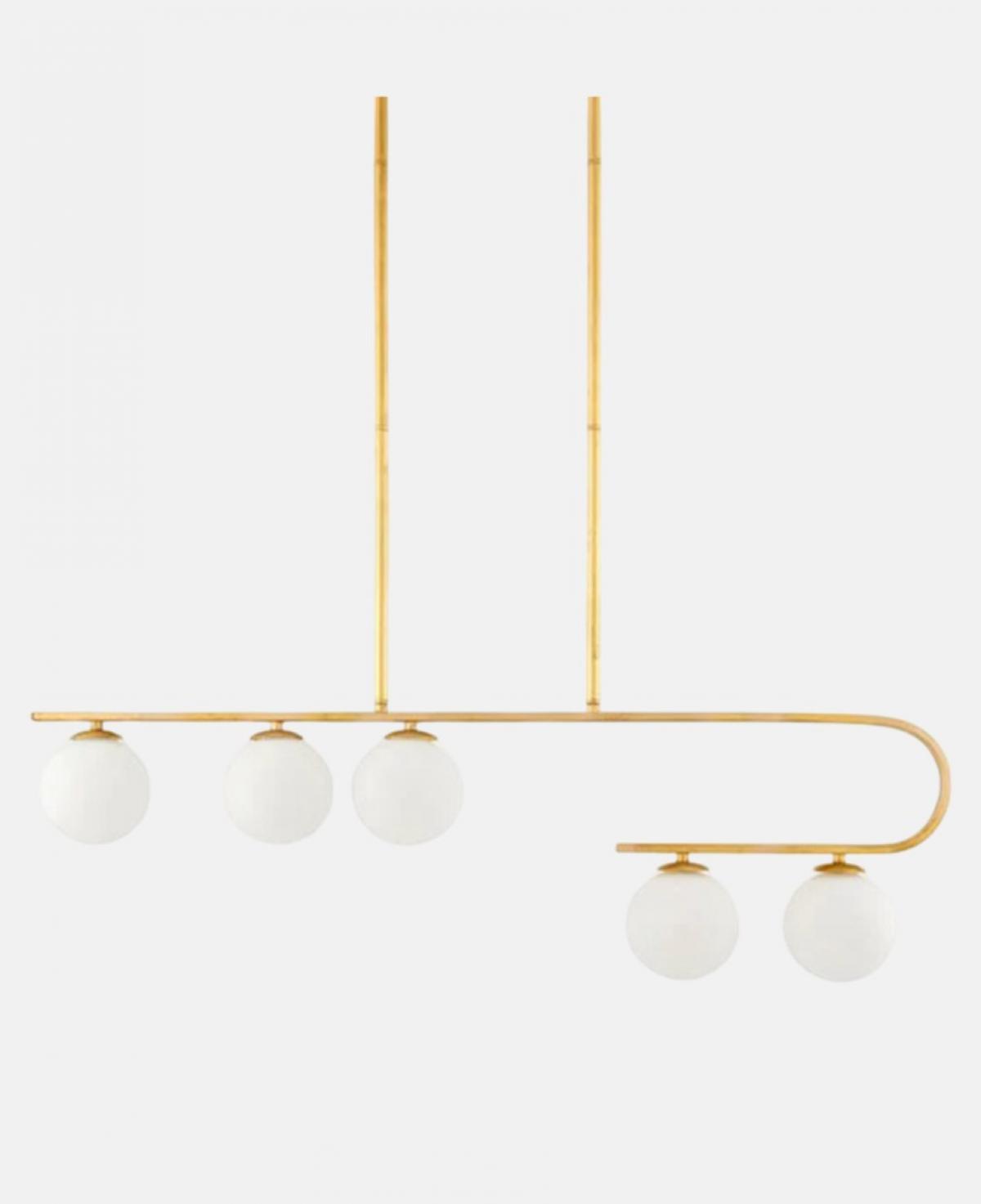 Zarif kavisli altın rengi metal gövde üzerinde farklı seviyelerde dizilmiş beş adet beyaz opal küre başlığıyla, mekanınıza sanatsal ve modern bir dokunuş katan şık aydınlatma.