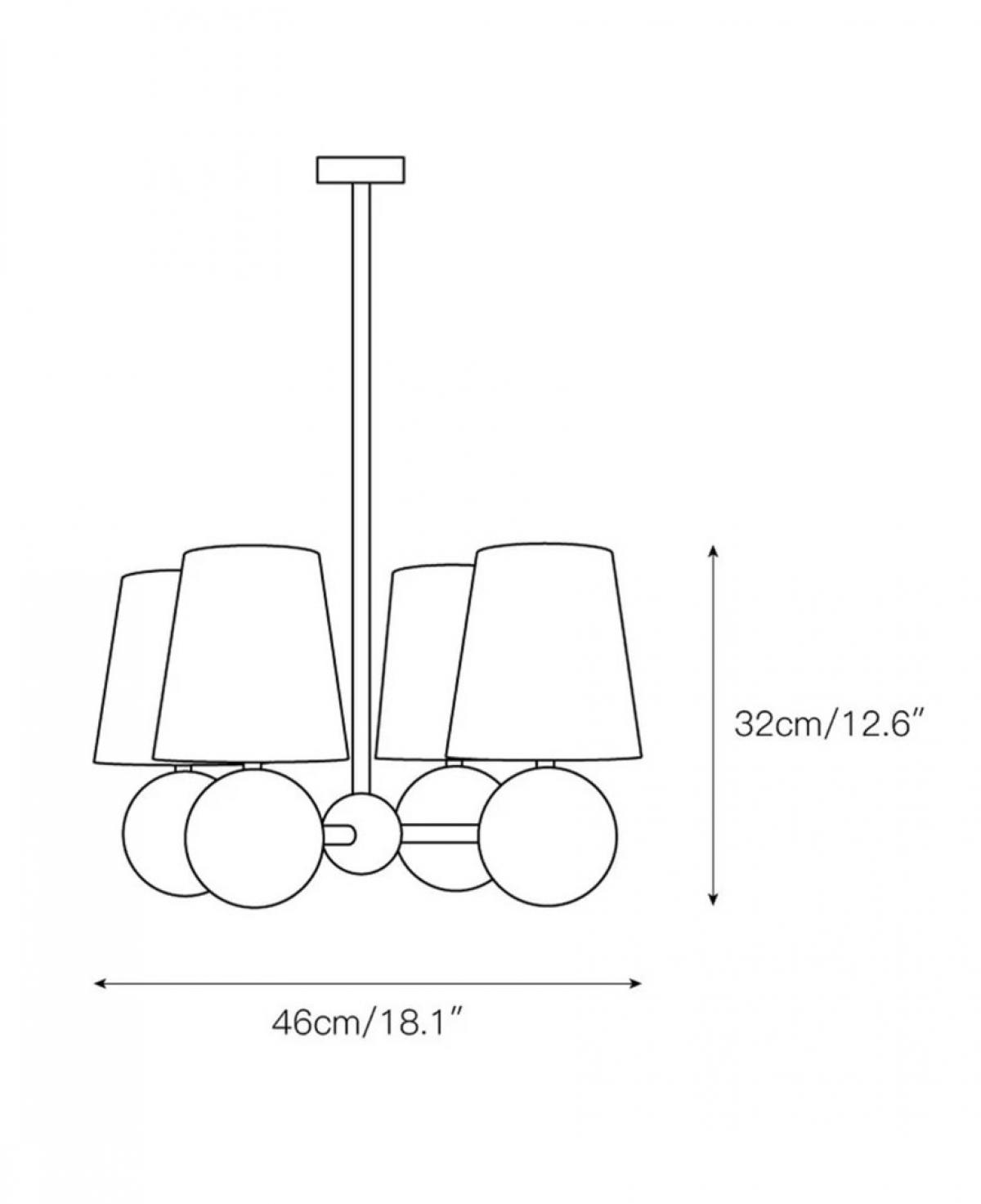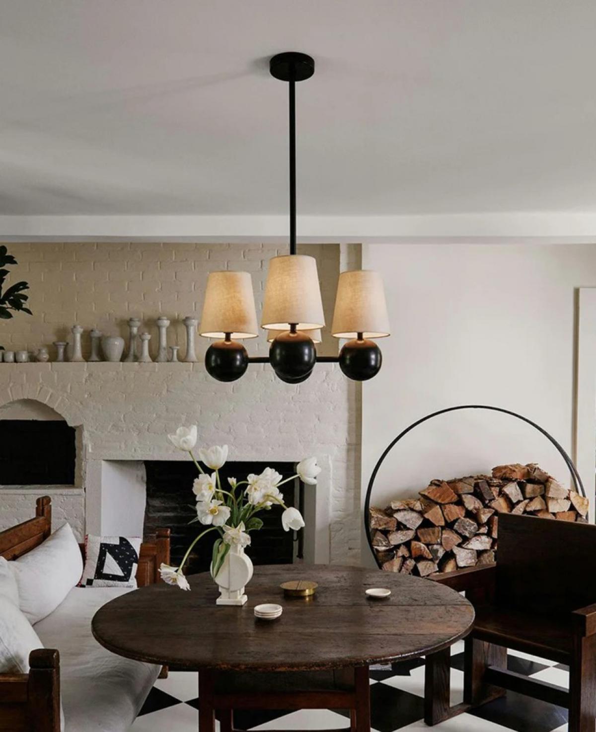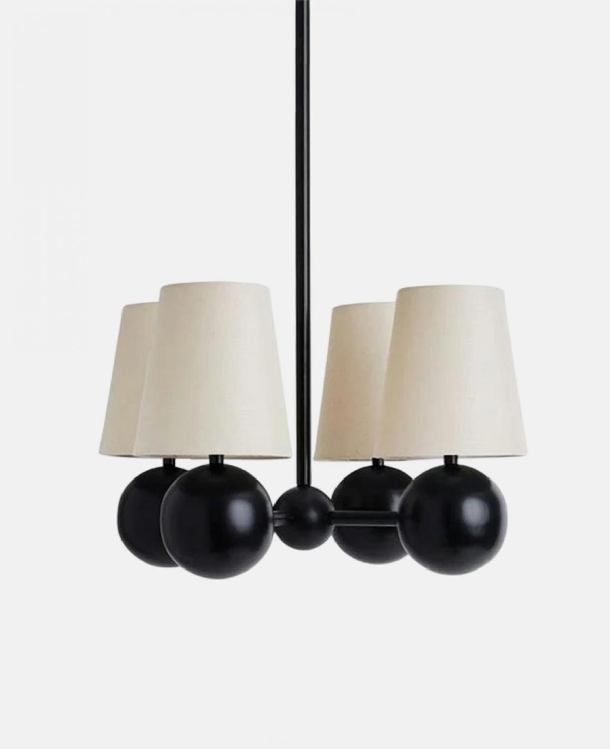 Mat siyah küre detaylı gövde üzerine oturtulmuş konik krem kumaş başlıklarıyla, klasik ve modern tarzı harmanlayan şık bir aydınlatma.