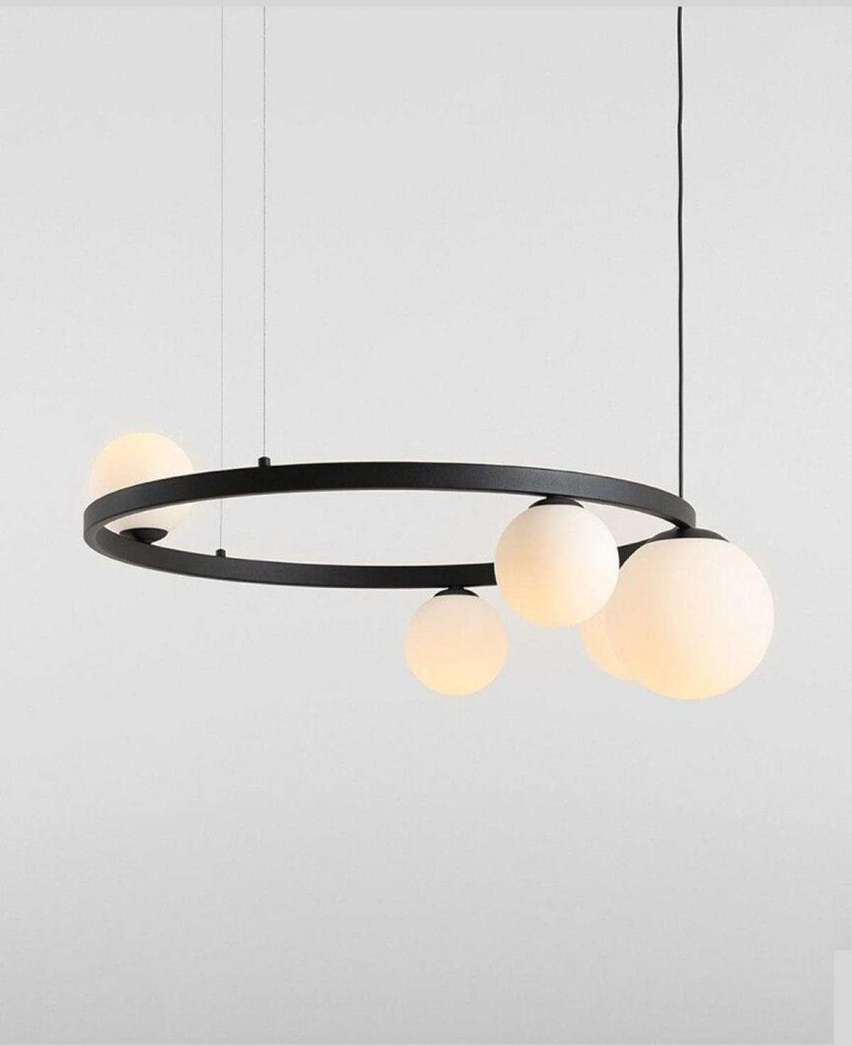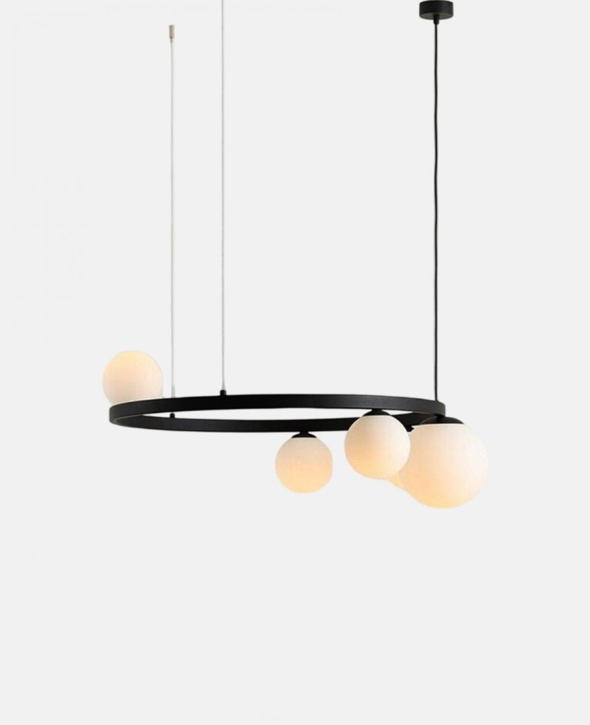 Mat siyah dairesel bir halka üzerine asimetrik olarak yerleştirilmiş, farklı boyutlarda beş adet beyaz opal cam küreden oluşan, minimalizmi sanatsal bir formla sunan modern sarkıt avize.