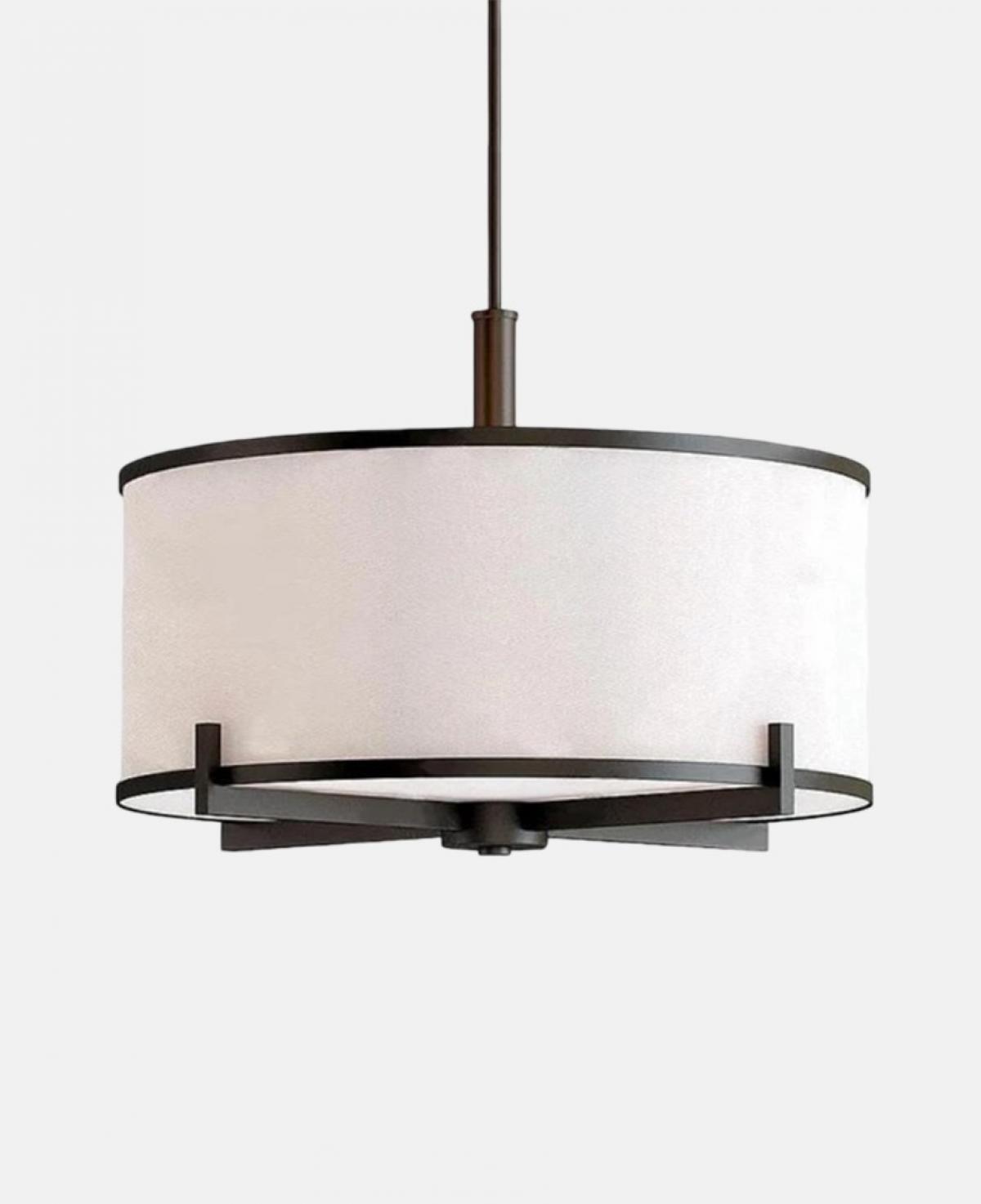 Mat siyah metal bir çerçeve ile desteklenen beyaz kumaş davul başlığı sayesinde ışığı yumuşatarak mekana homojen bir şekilde dağıtan, sade ve modern tasarımlı şık sarkıt avize.