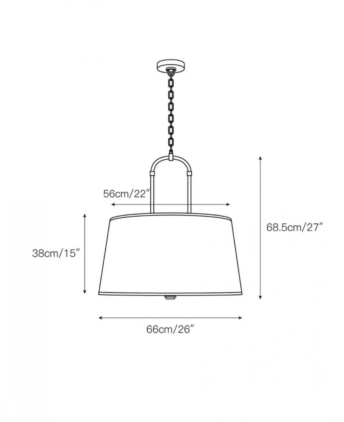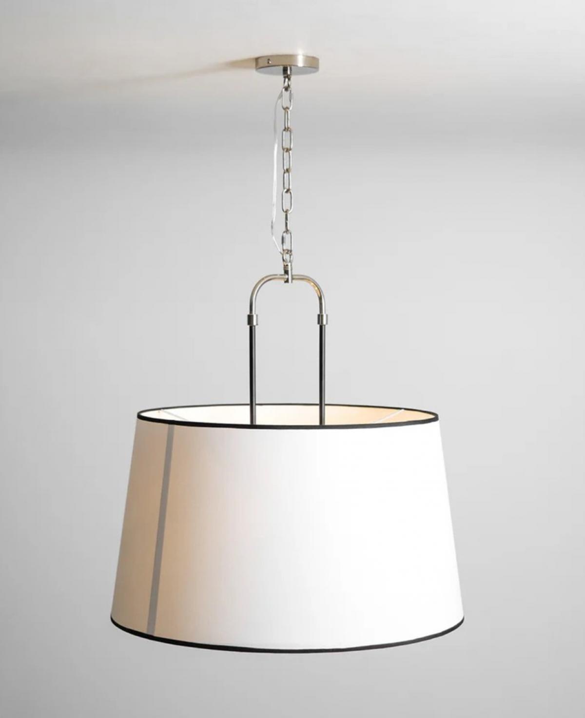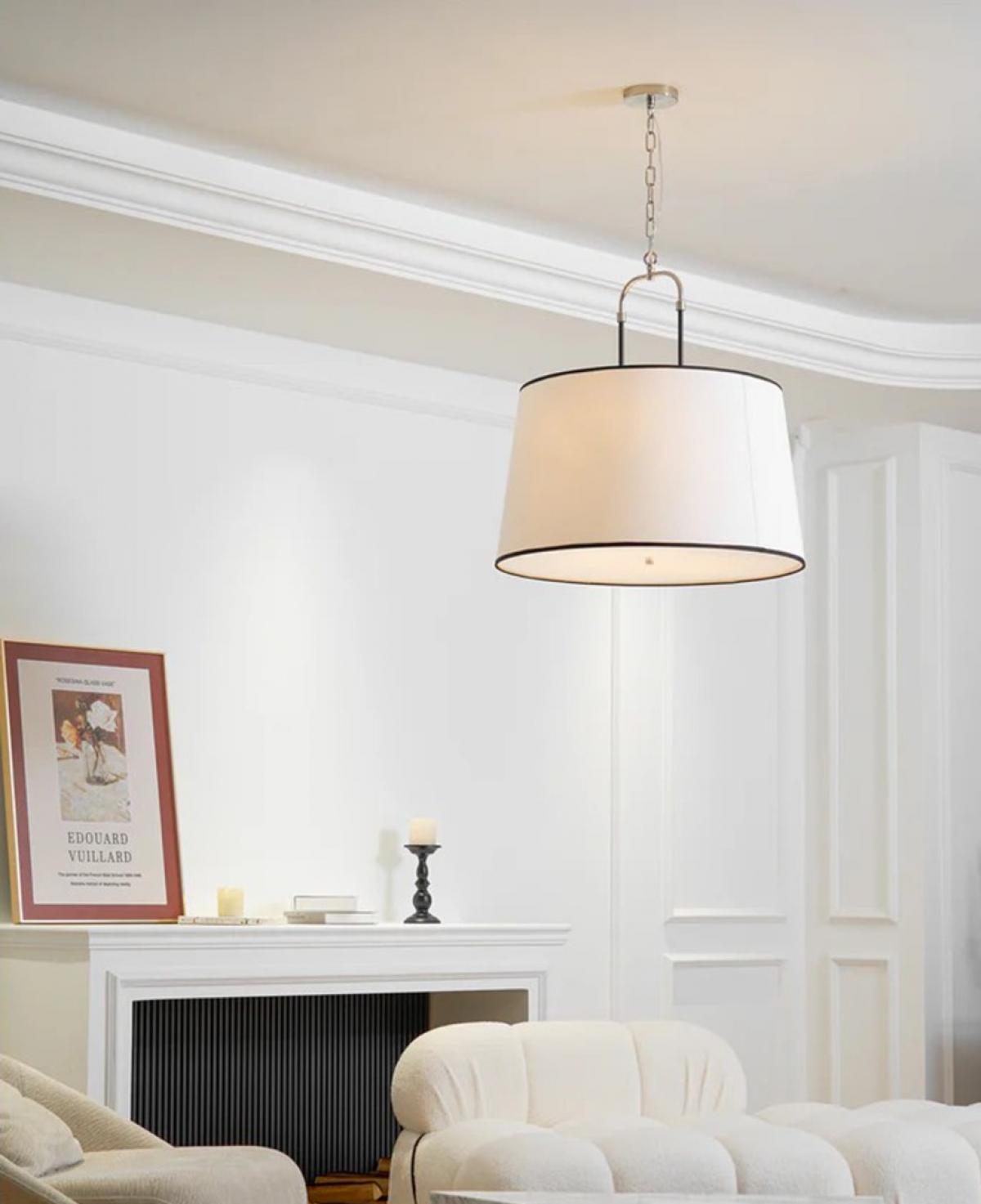 Üst ve alt kenarlarında ince siyah şerit detayları bulunan beyaz konik kumaş başlığı, zarif bir kavisle birleşen metal askı kolu ve klasik zincir detayıyla hem modern hem de zamansız bir aydınlatma tasarımı.
