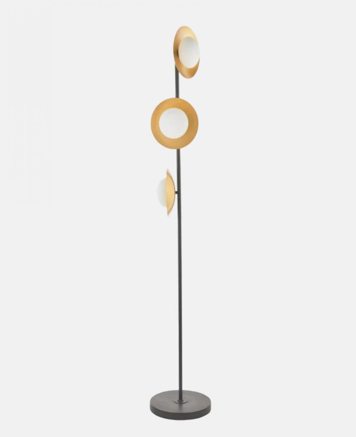 İnce siyah bir gövde üzerinde farklı yüksekliklerde ve yönlerde yerleştirilmiş, iç kısımları altın rengi üç adet dekoratif çanak ve merkezlerindeki opal cam kürelerden oluşan, estetik ve modern bir dekoratif aydınlatma.