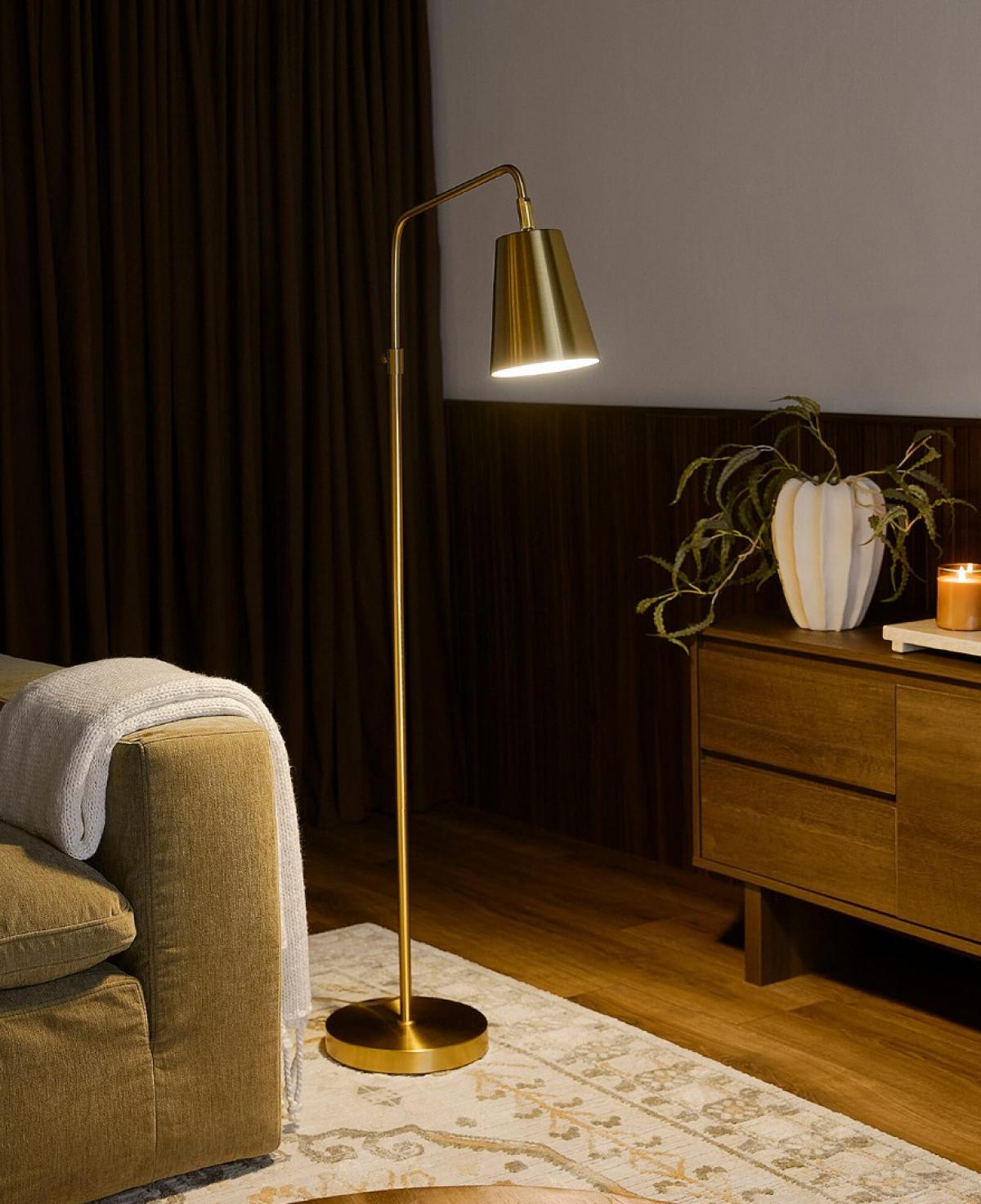 İnce siyah bir gövde üzerinde farklı yüksekliklerde ve yönlerde yerleştirilmiş, iç kısımları altın rengi üç adet dekoratif çanak ve merkezlerindeki opal cam kürelerden oluşan, estetik ve modern bir dekoratif aydınlatma.