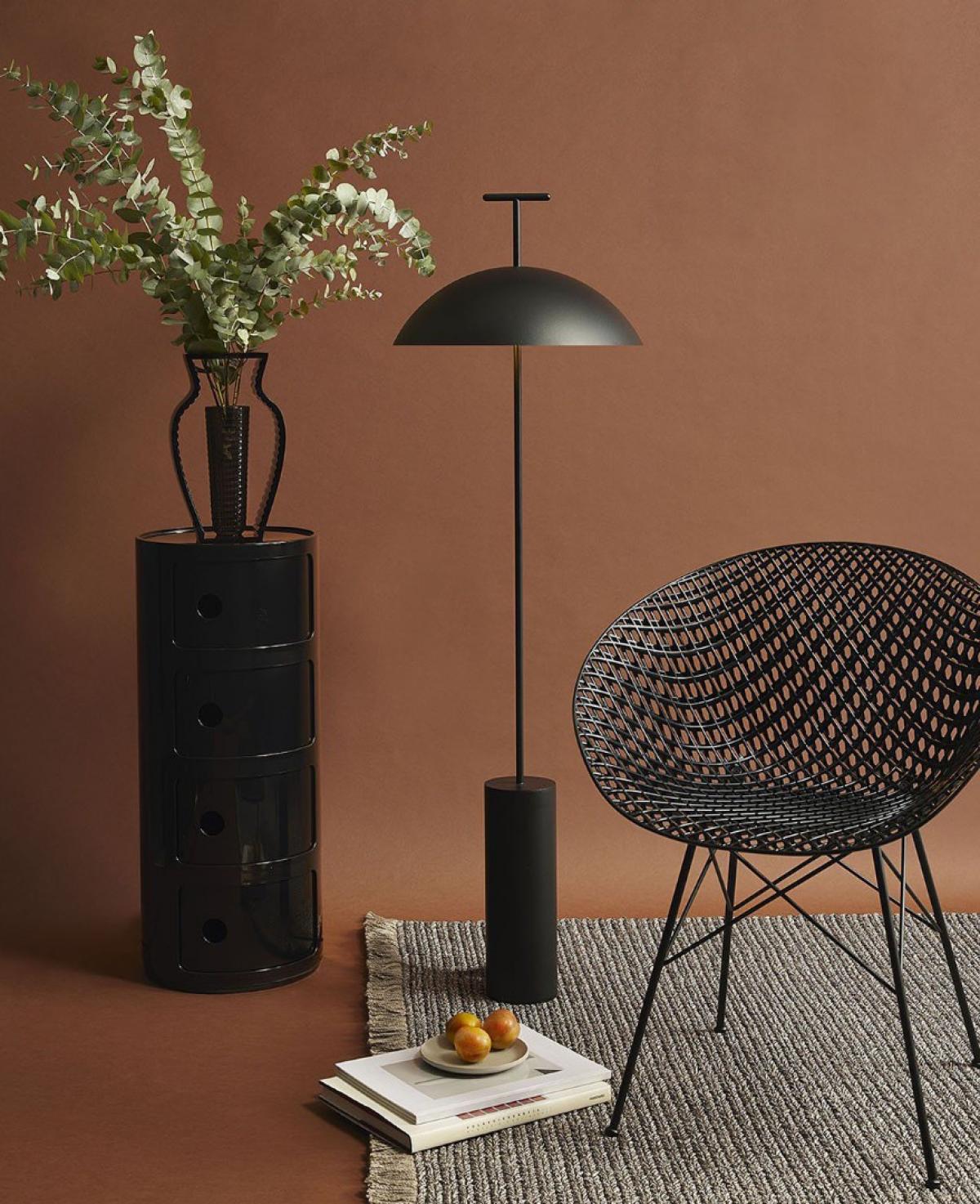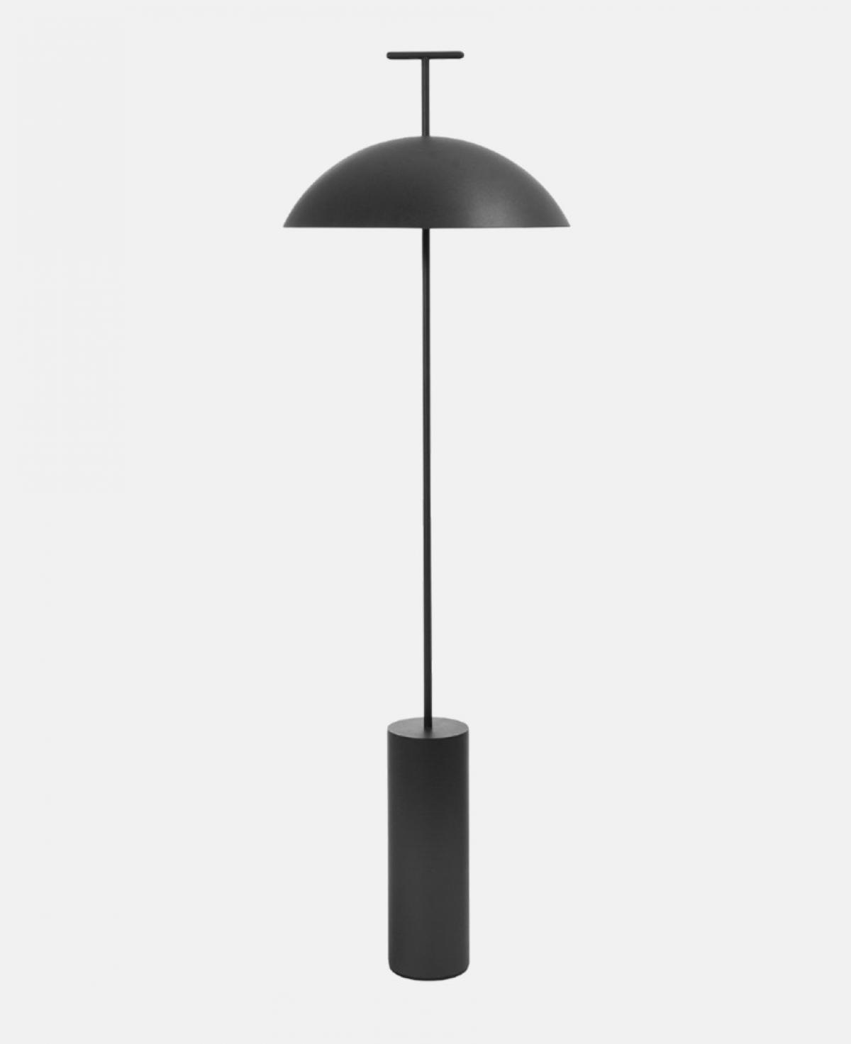 Mat siyah silindirik bir taban üzerinde yükselen ince gövde ve üzerinde T şeklinde bir kulb bulunan geniş, kubbe şeklinde siyah metal şapkasıyla minimalizmi ve endüstriyel şıklığı bir araya getiren lambader.