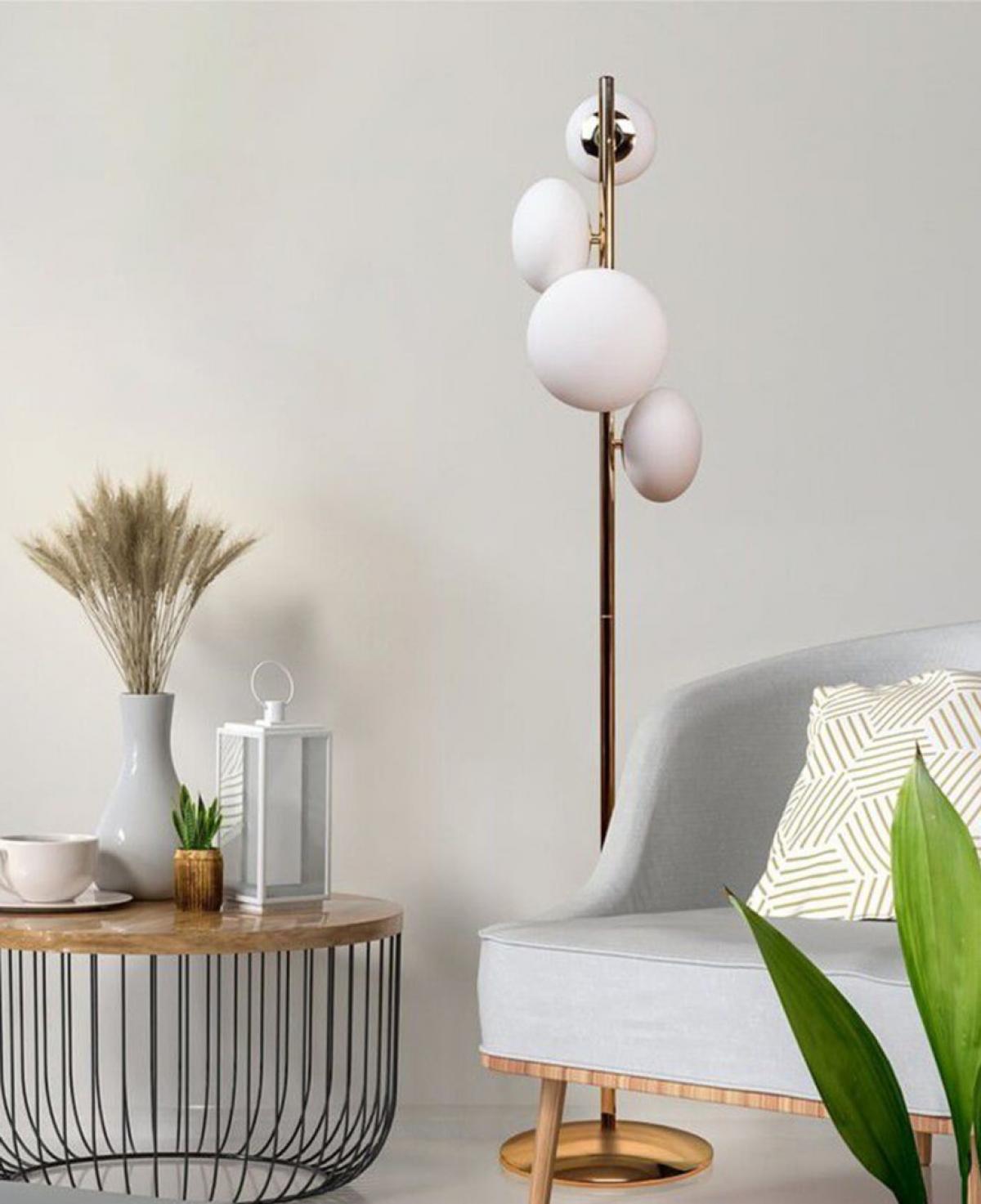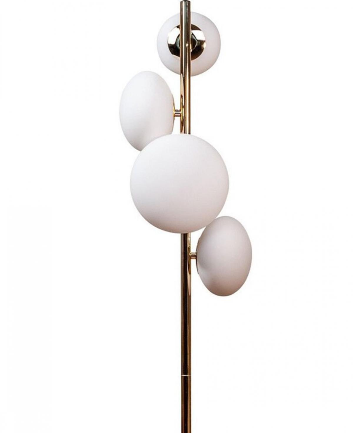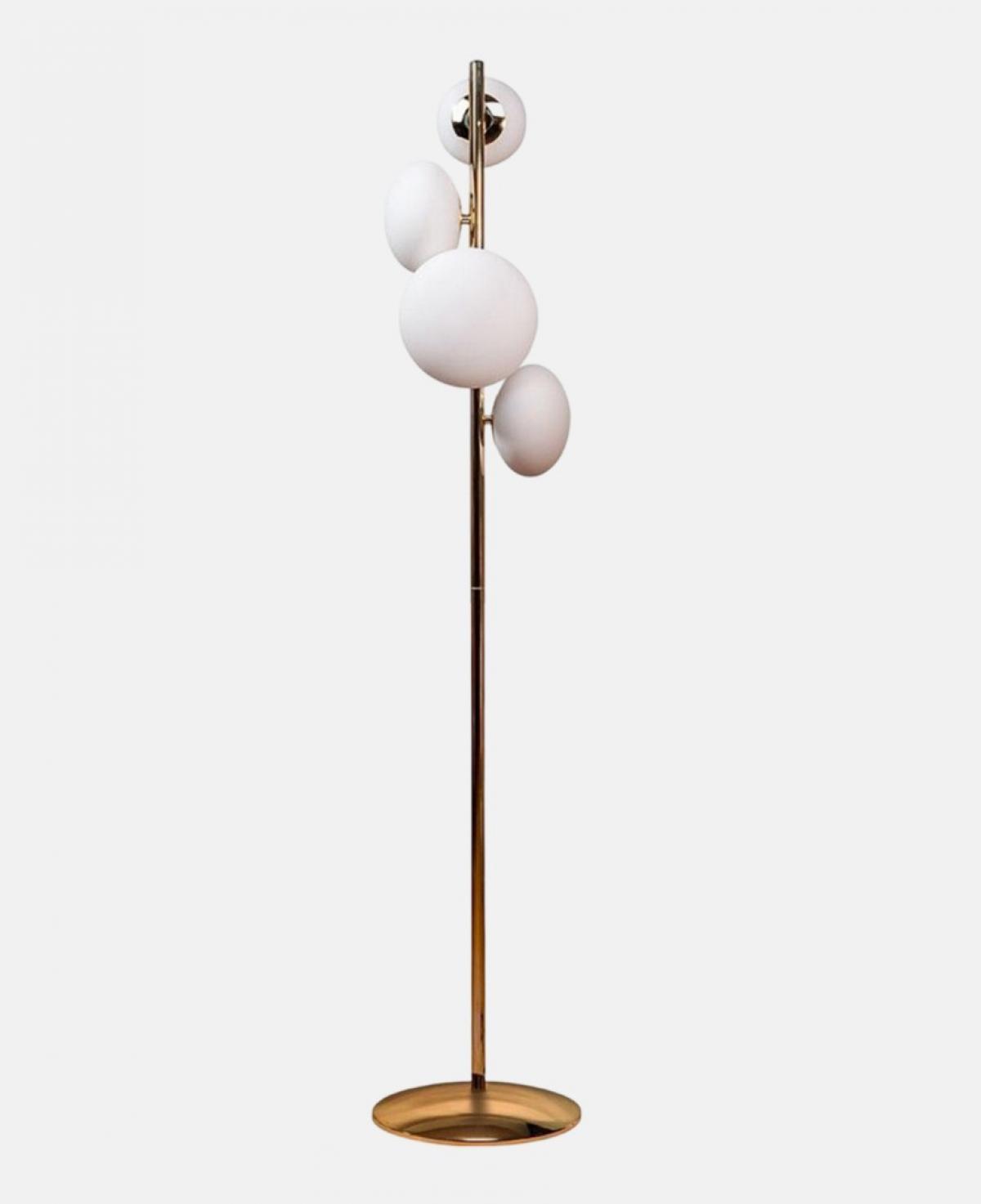 Parlak altın rengi ince bir gövde üzerinde farklı boyutlarda ve yönlerde kümelenmiş dört adet beyaz opal cam küreden oluşan, mekana yumuşak bir ışık ve sanatsal bir derinlik katan estetik lambader.