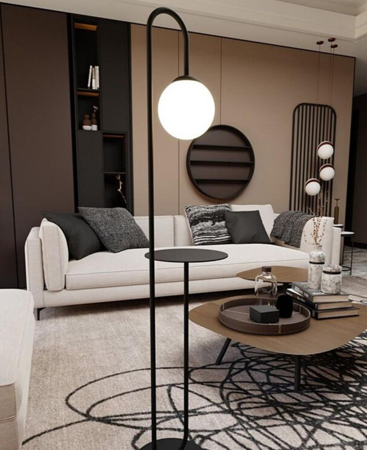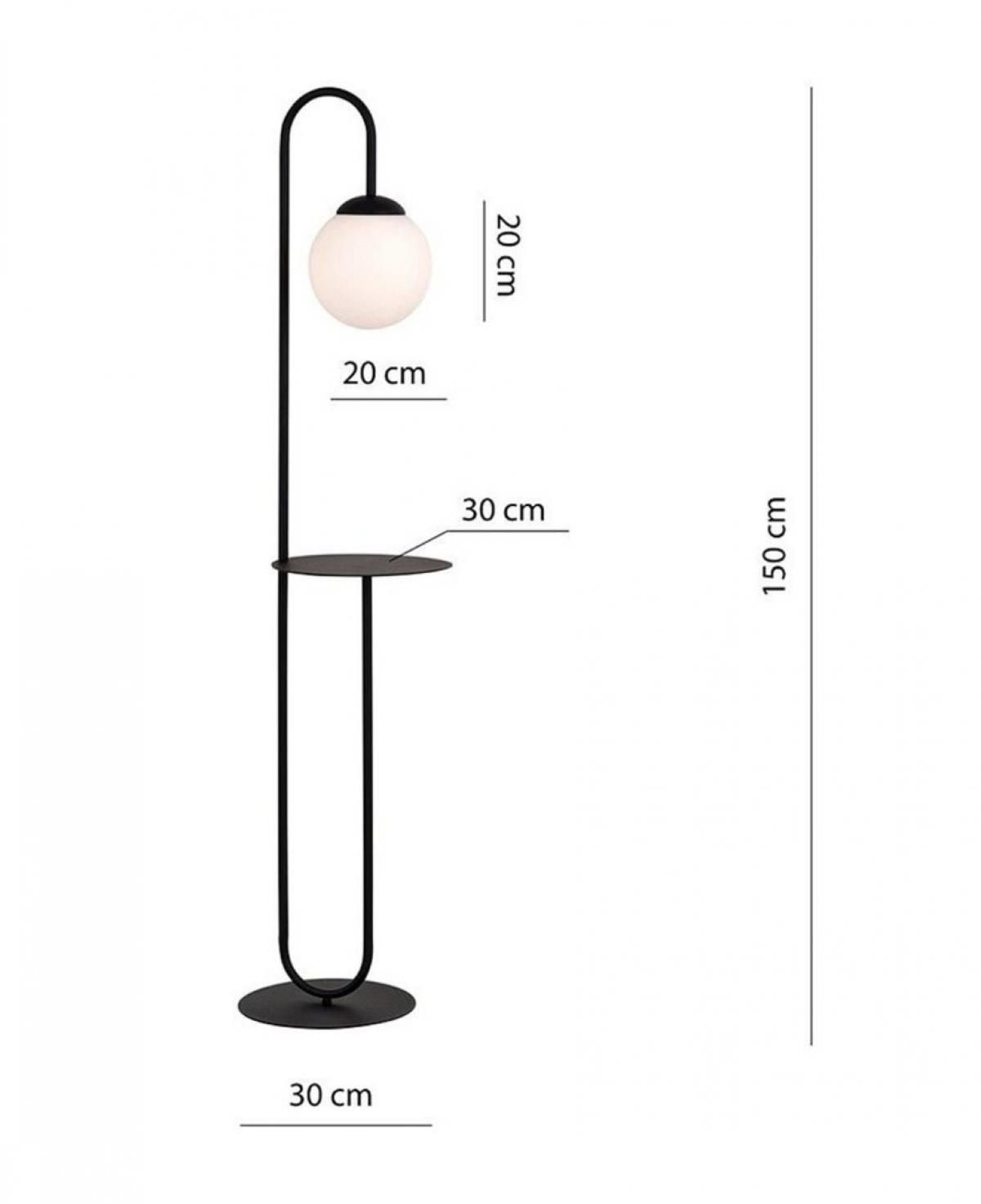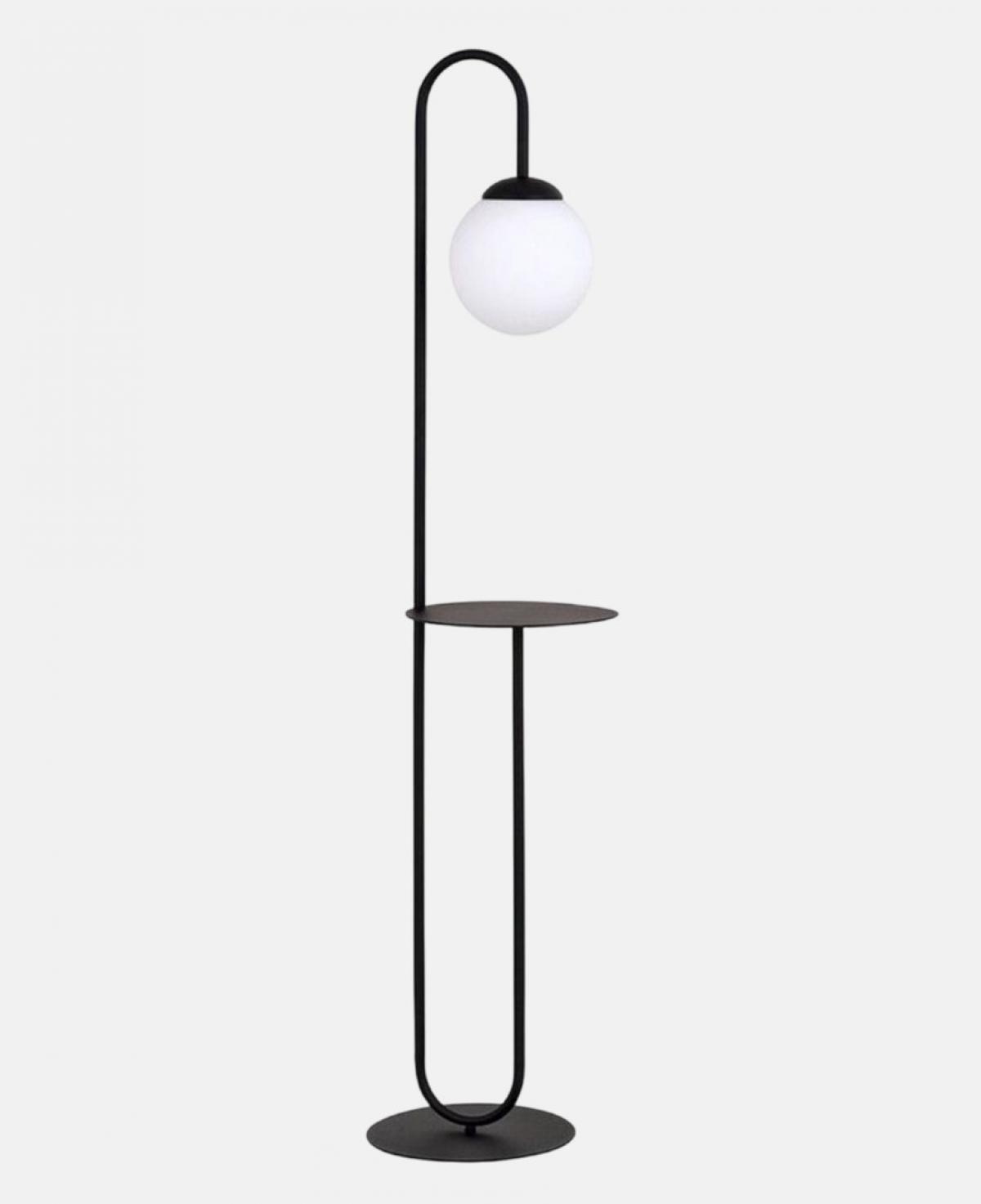 İnce siyah metal gövdesi üzerinde fonksiyonel bir sehpa detayı barındıran, zarif kavisli boyun yapısı ve beyaz opal cam küresiyle hem aydınlatma hem de kullanım kolaylığı sunan minimalist lambader.