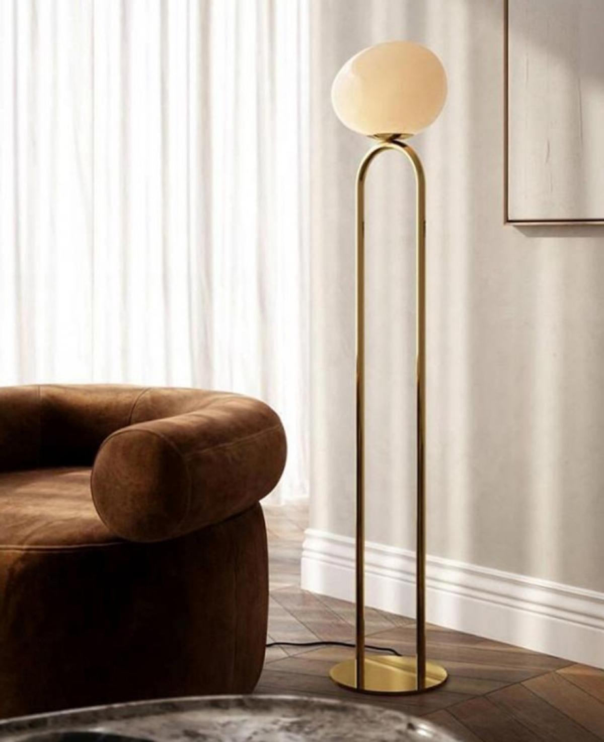 İnce siyah metal gövdesi üzerinde fonksiyonel bir sehpa detayı barındıran, zarif kavisli boyun yapısı ve beyaz opal cam küresiyle hem aydınlatma hem de kullanım kolaylığı sunan minimalist lambader.