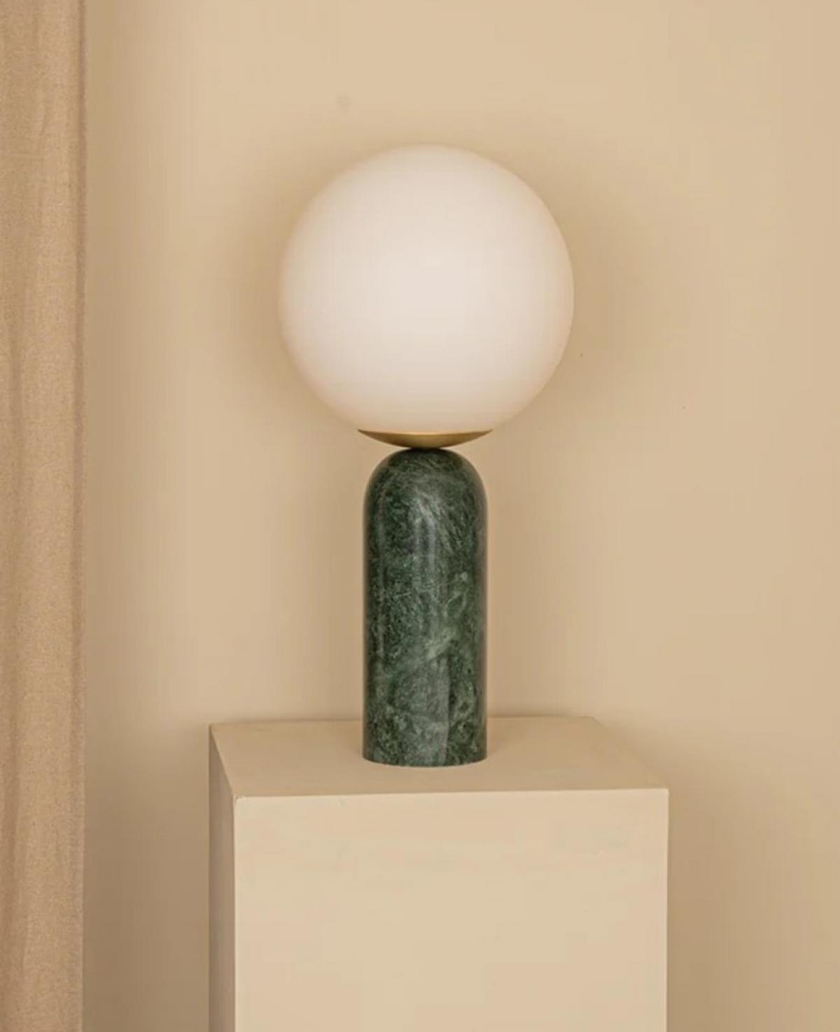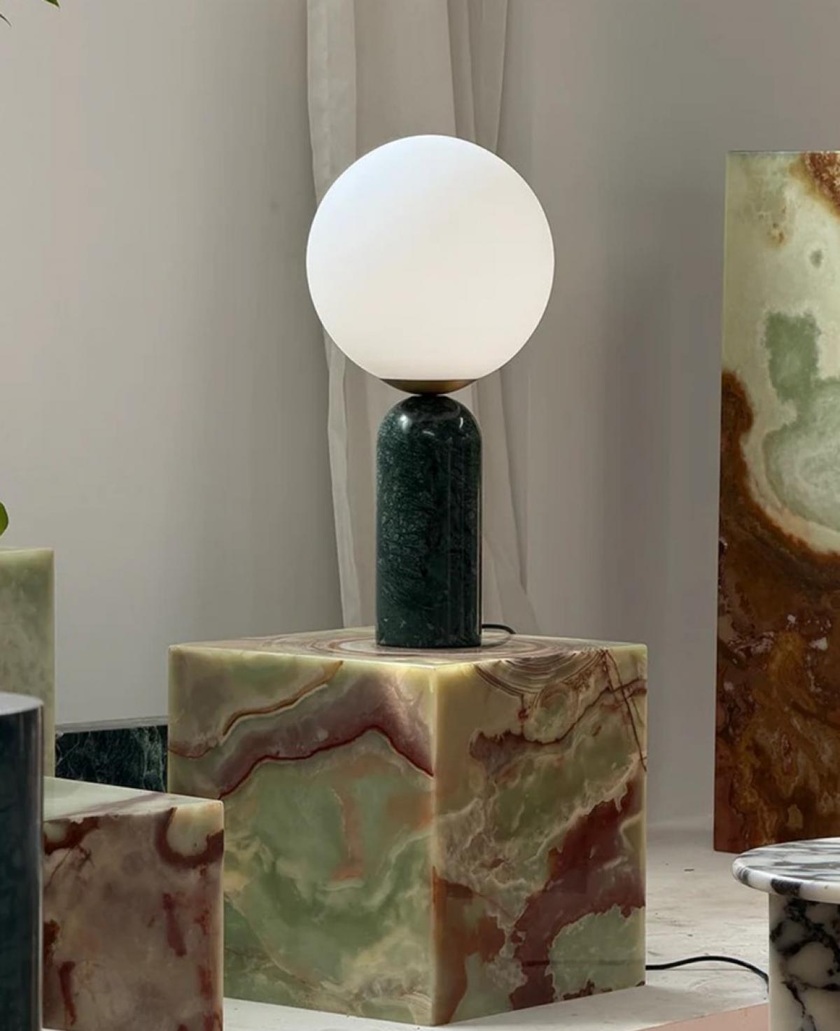 Zengin dokulu yeşil mermer kaidesi ve altın detaylı opal cam küresiyle, mekanınıza doğal bir lüks ve göz yormayan soft bir aydınlatma sunar.