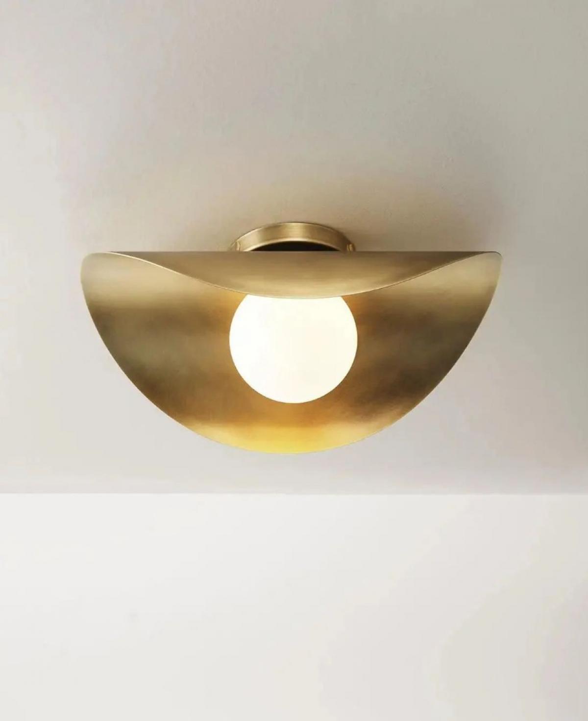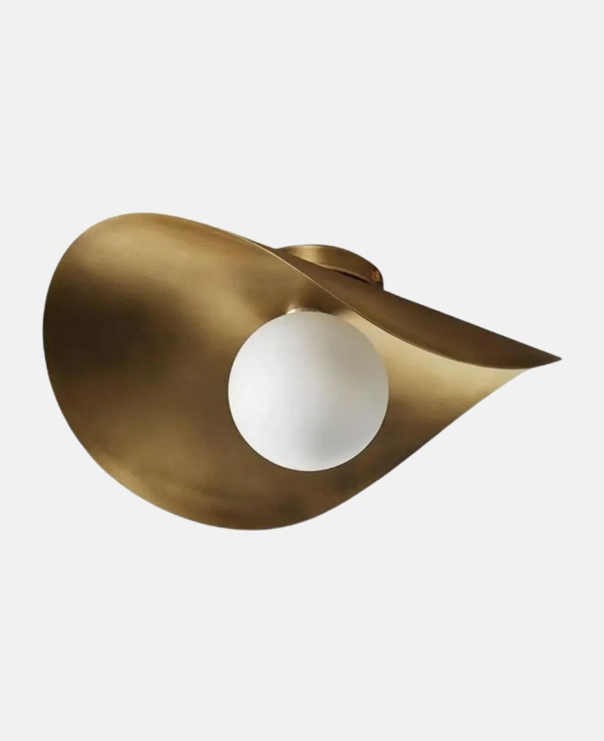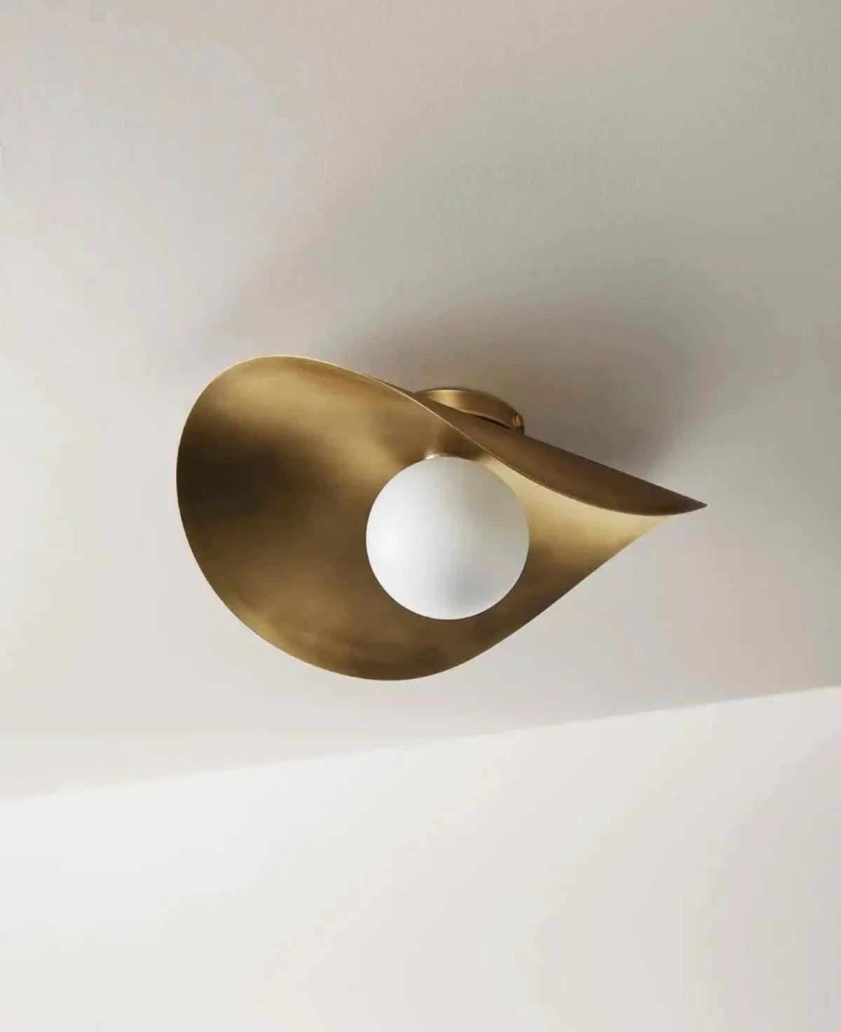 Soyut bir yaprak veya dalga formunu andıran kavisli altın pirinç plakası ve merkezindeki beyaz opal cam küresiyle, tavanda sanatsal bir gölge oyunu ve sıcak bir ambiyans yaratan estetik aydınlatma.