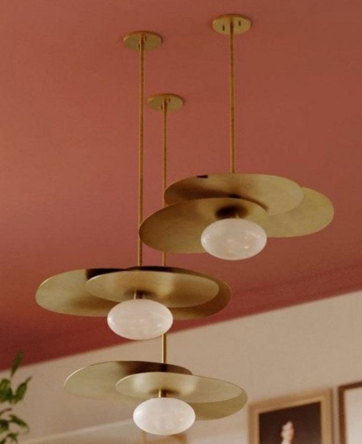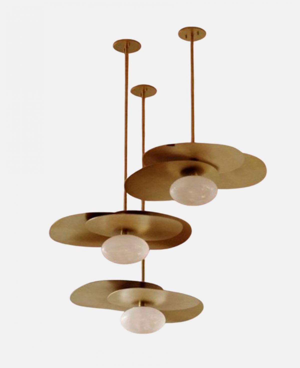 Mat siyah dairesel bir tavan tablası etrafına simetrik olarak yerleştirilmiş üç adet beyaz opal cam küreden oluşan, minimalist tasarımıyla modern mekanlara sade ve etkileyici bir aydınlatma sunan tavan armatürü.