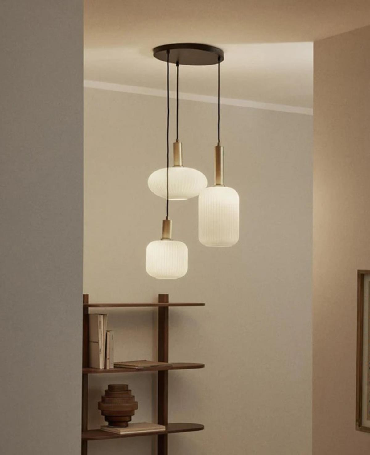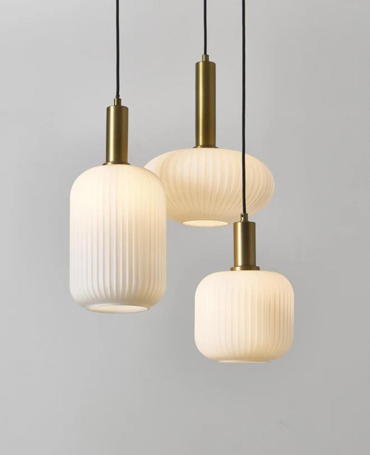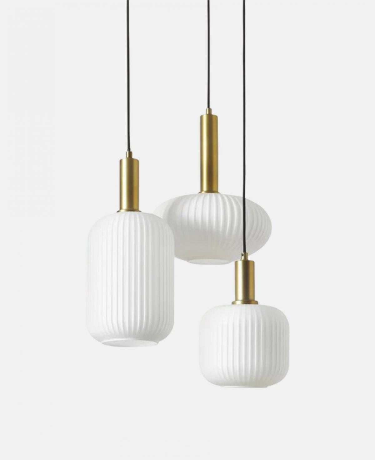 Farklı geometrik formlara sahip, dikey çizgili dokulu üç adet beyaz cam başlıktan oluşan; altın rengi metal duy detaylarıyla zenginleştirilmiş, mekana yumuşak ve estetik bir ışık yayan modern sarkıt avize.