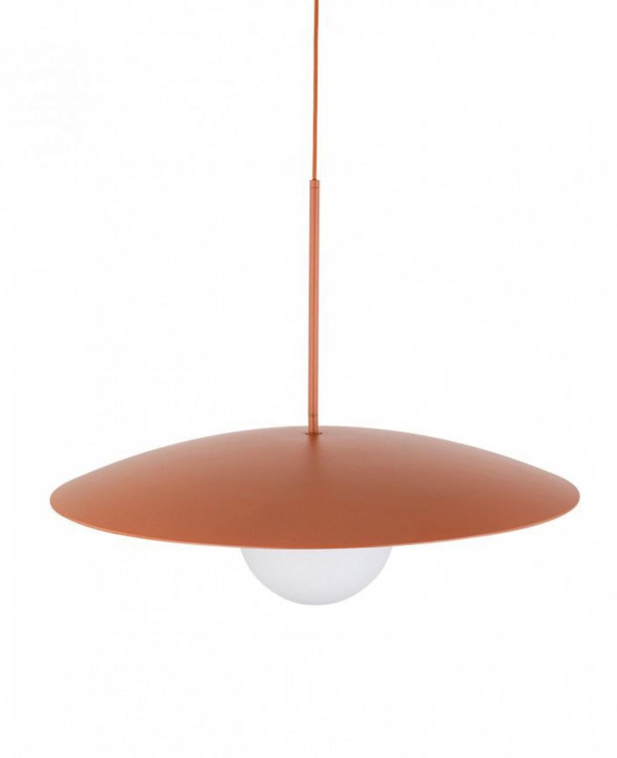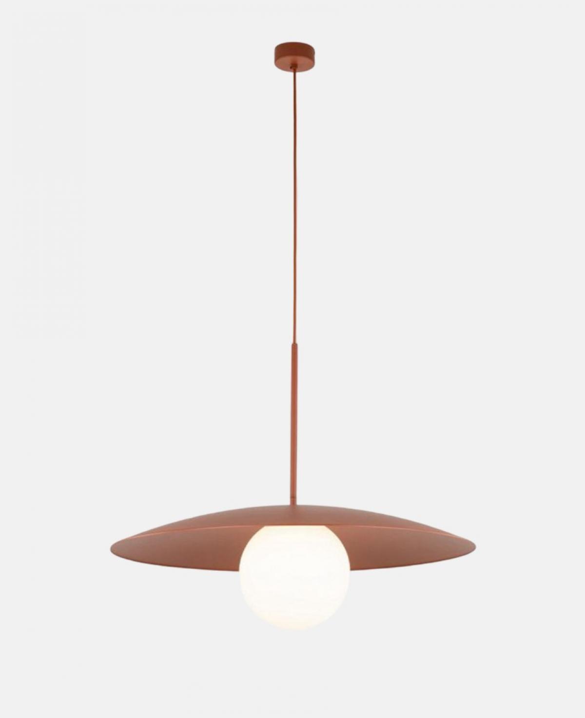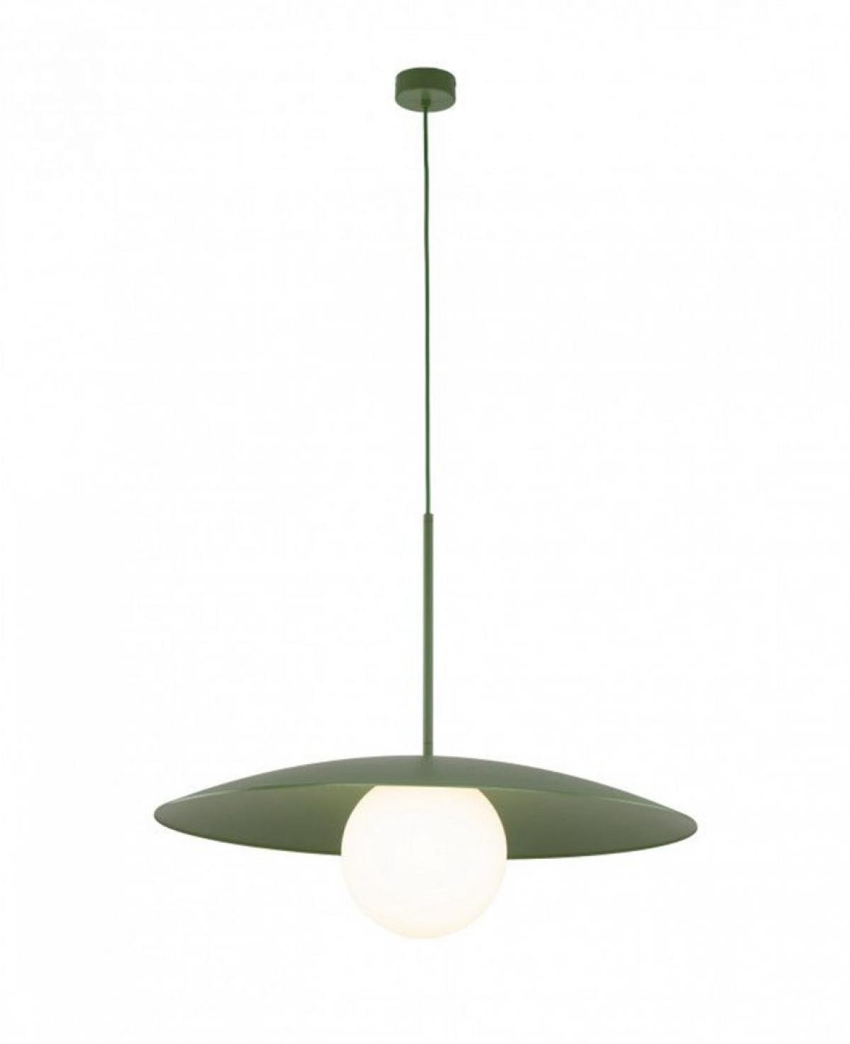 Mat yeşil geniş metal başlığı ve merkezindeki beyaz opal cam küresiyle minimalist bir estetik sunan, mekana dingin ve modern bir atmosfer katan şık sarkıt aydınlatma.
