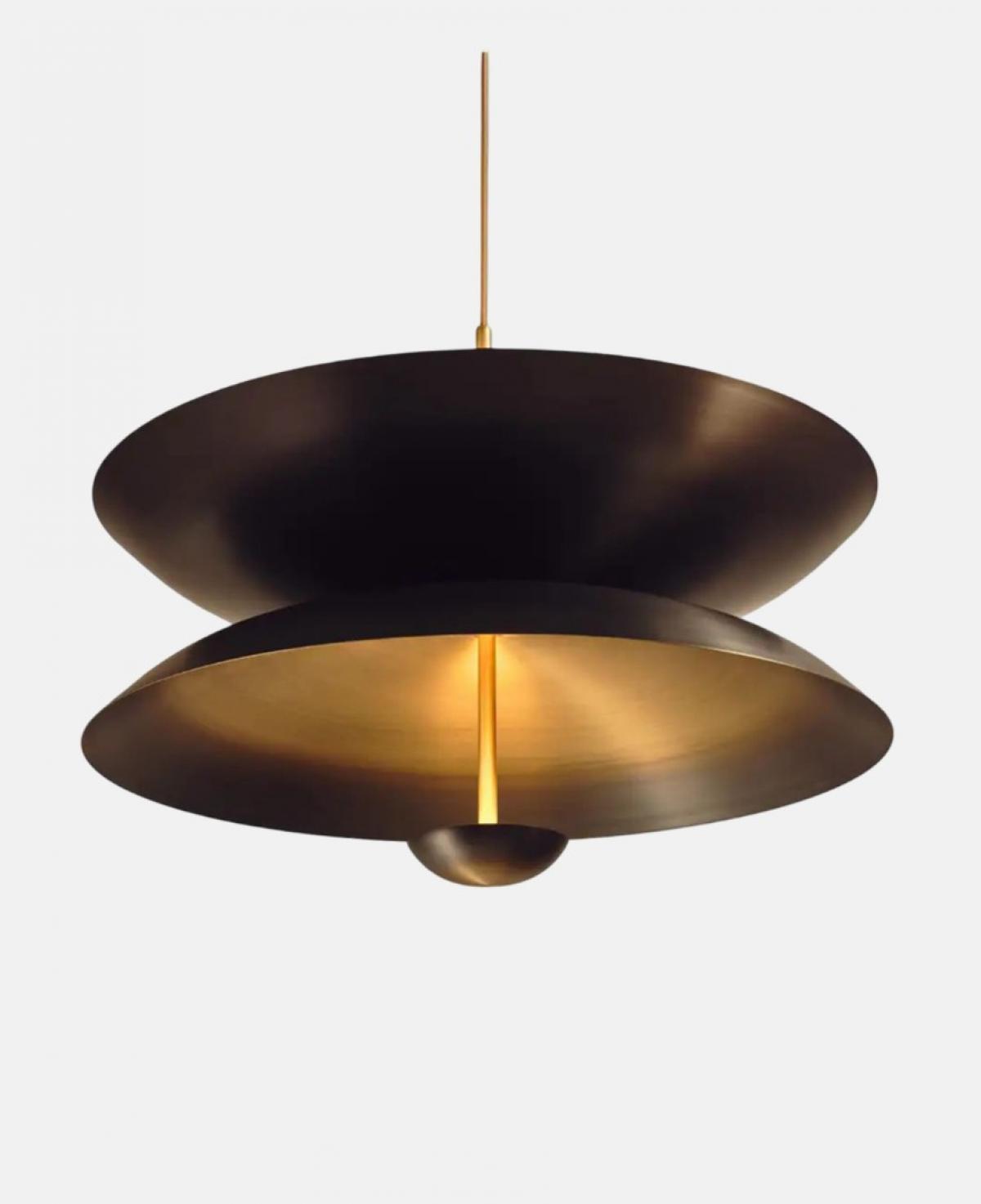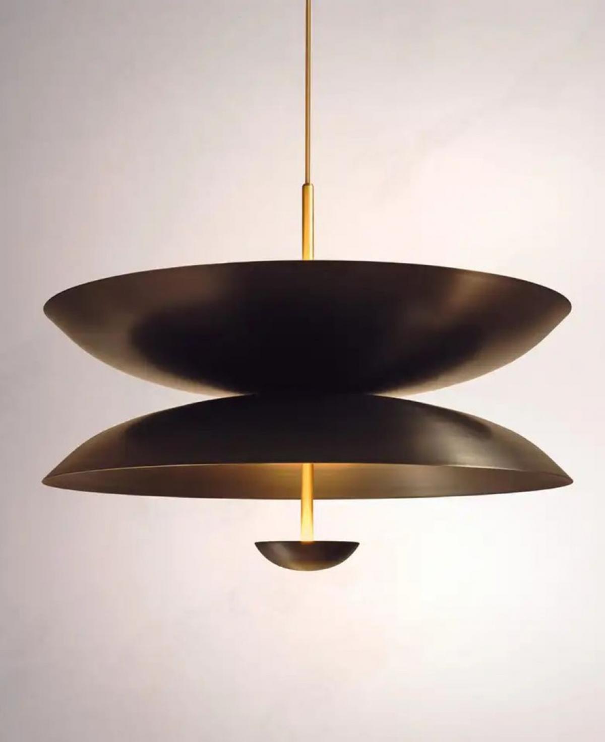 Üst üste binmiş iki adet MAT PİRİNÇ geniş disk başlık ve iç kısımdaki fırçalanmış pirinç dokusunun yansımalarıyla tasarlanmış; ışığı hem aşağı hem yukarı yönlendirerek mekana dramatik bir derinlik katan lüks sarkıt aydınlatma.