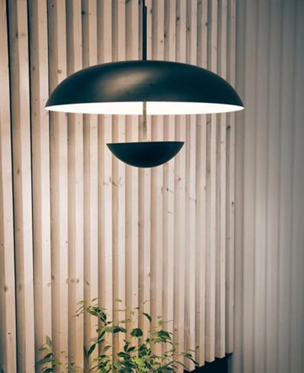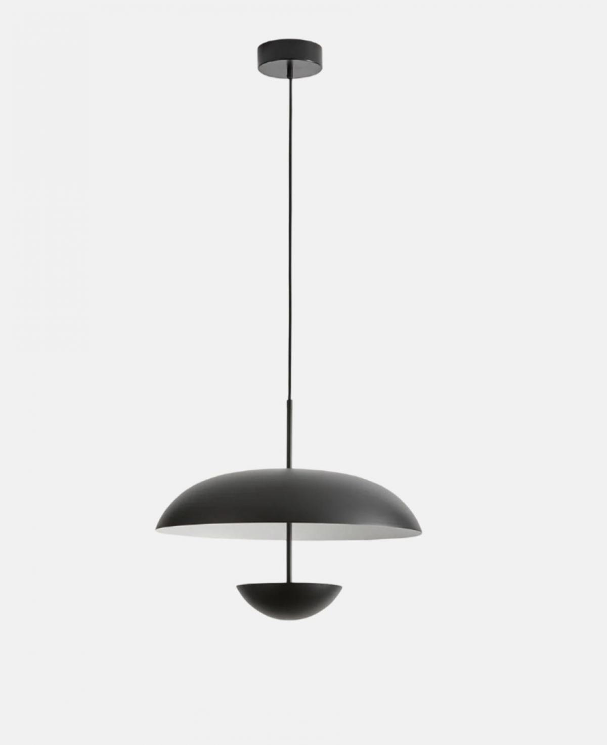Mat siyah dış gövdesi ve kontrast yaratan beyaz iç yüzeyiyle tasarlanmış, üstte geniş bir kubbe ve altta ışığı yumuşatan daha küçük bir kaseden oluşan, minimalist ve heykelsi bir sarkıt aydınlatma.