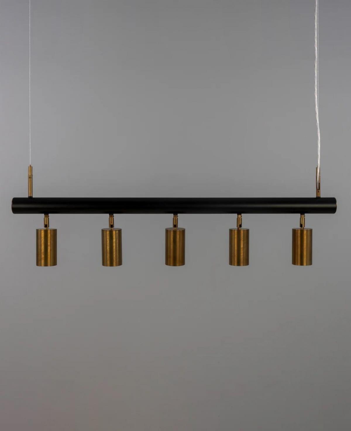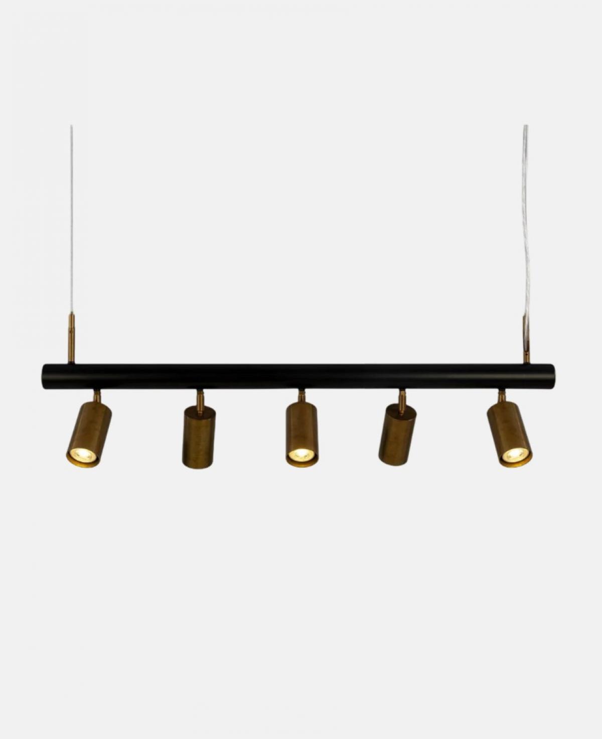 Yatay siyah metal bir gövde üzerine dizilmiş, aşağı bakan beş adet eskitme gold (pirinç) rengi silindir başlıktan oluşan; odaklanmış aydınlatma sağlayan, endüstriyel ve modern tarzı birleştiren şık lineer avize.