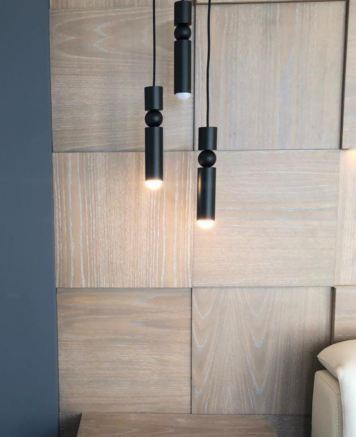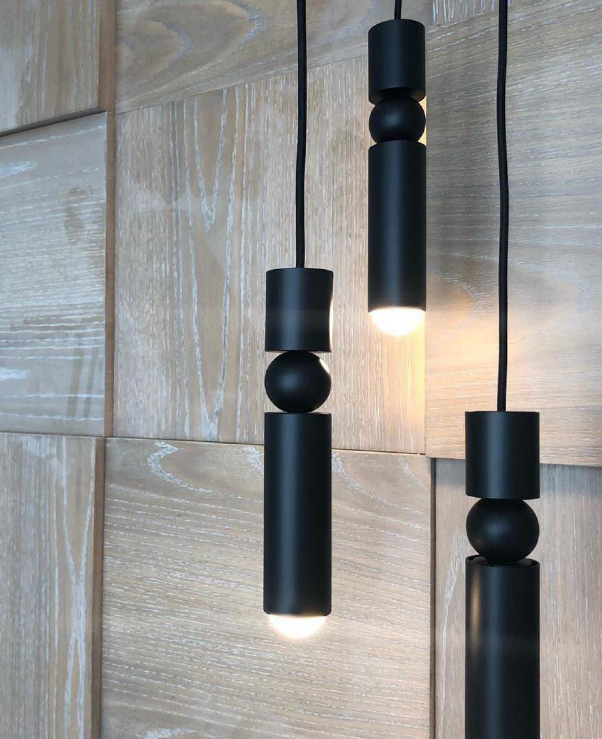 Minimalist bir tasarıma sahip, siyah mat gövdeli ve merkezinde dekoratif küre detayı bulunan üç adet silindirik başlıktan oluşan, odaklanmış aydınlatma sunan modern sarkıt avize.