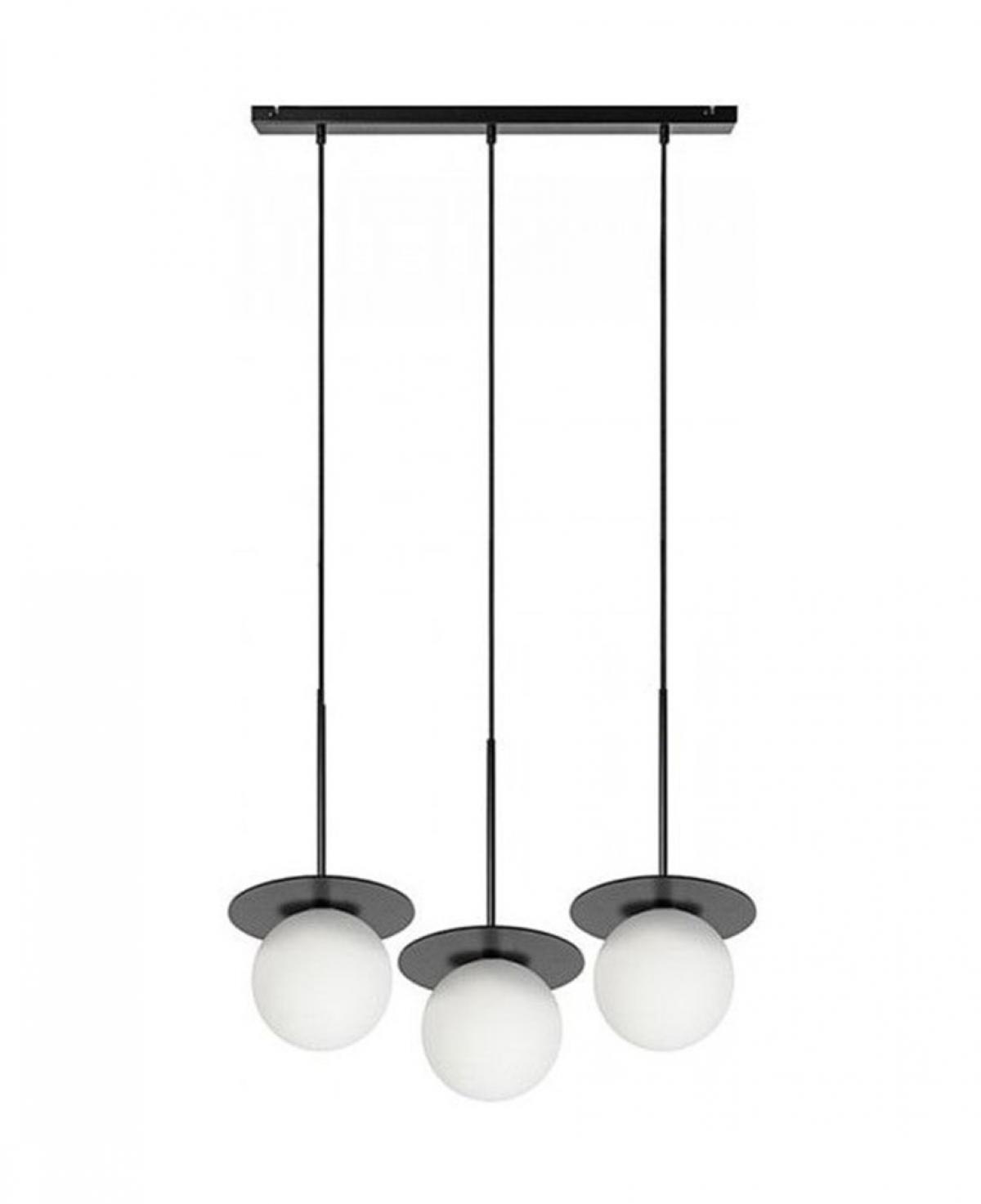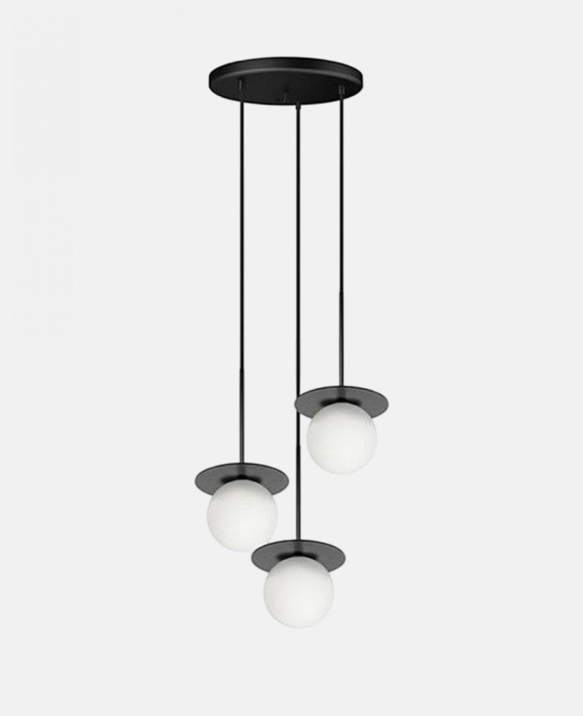 Dairesel siyah bir tavan tablasından farklı boylarda sarkan üç adet beyaz opal cam küre ve üzerlerindeki minimalist siyah disk başlıklarla tasarlanmış, modern ve dengeli bir aydınlatma sunan estetik sarkıt avize.